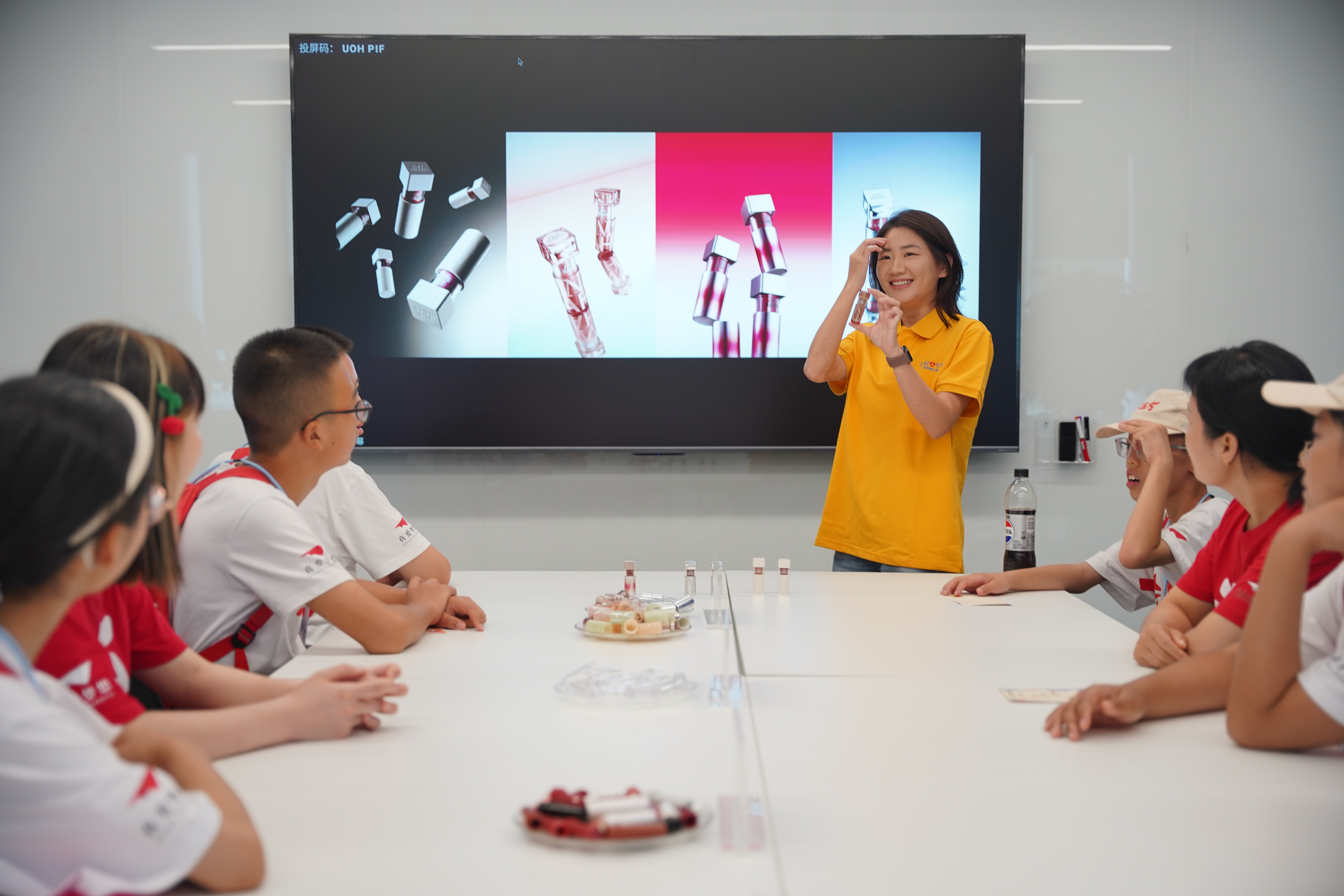 产品设计部志愿者Doria利用一支口红的5个零部件,引导同学们自主搭配不同的组合,在观察、挑选与尝试中体验设计之美。