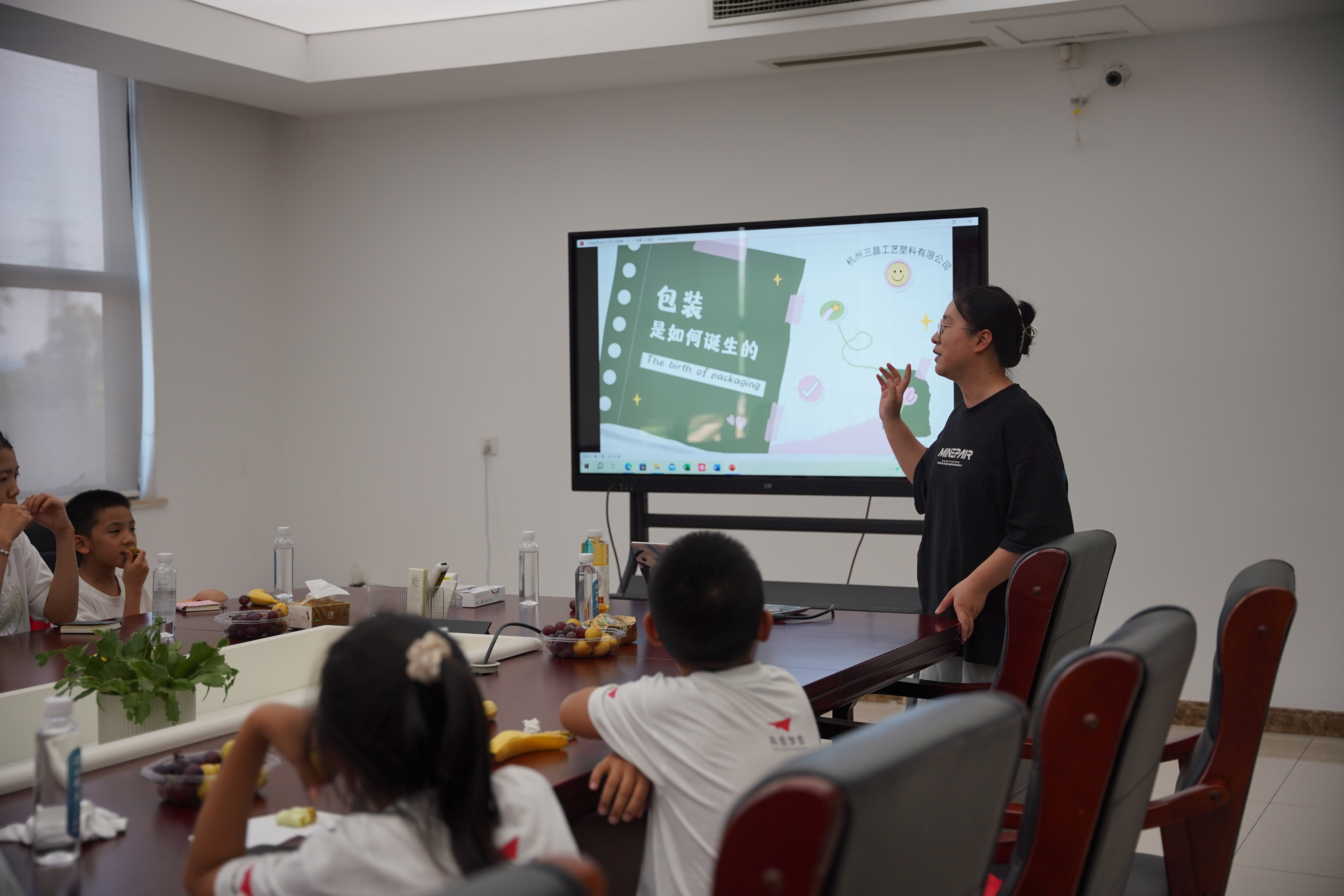 包装是如何诞生的?志愿者周周老师生动讲解了塑料包装从原材料到成品的过程。“我学到了许多新知识,比如我知道了水瓶是用PE(聚乙烯)做的,尺子是用PS(聚苯乙烯)做的。”来自江西宜春的丁逸轩同学分享了收获。