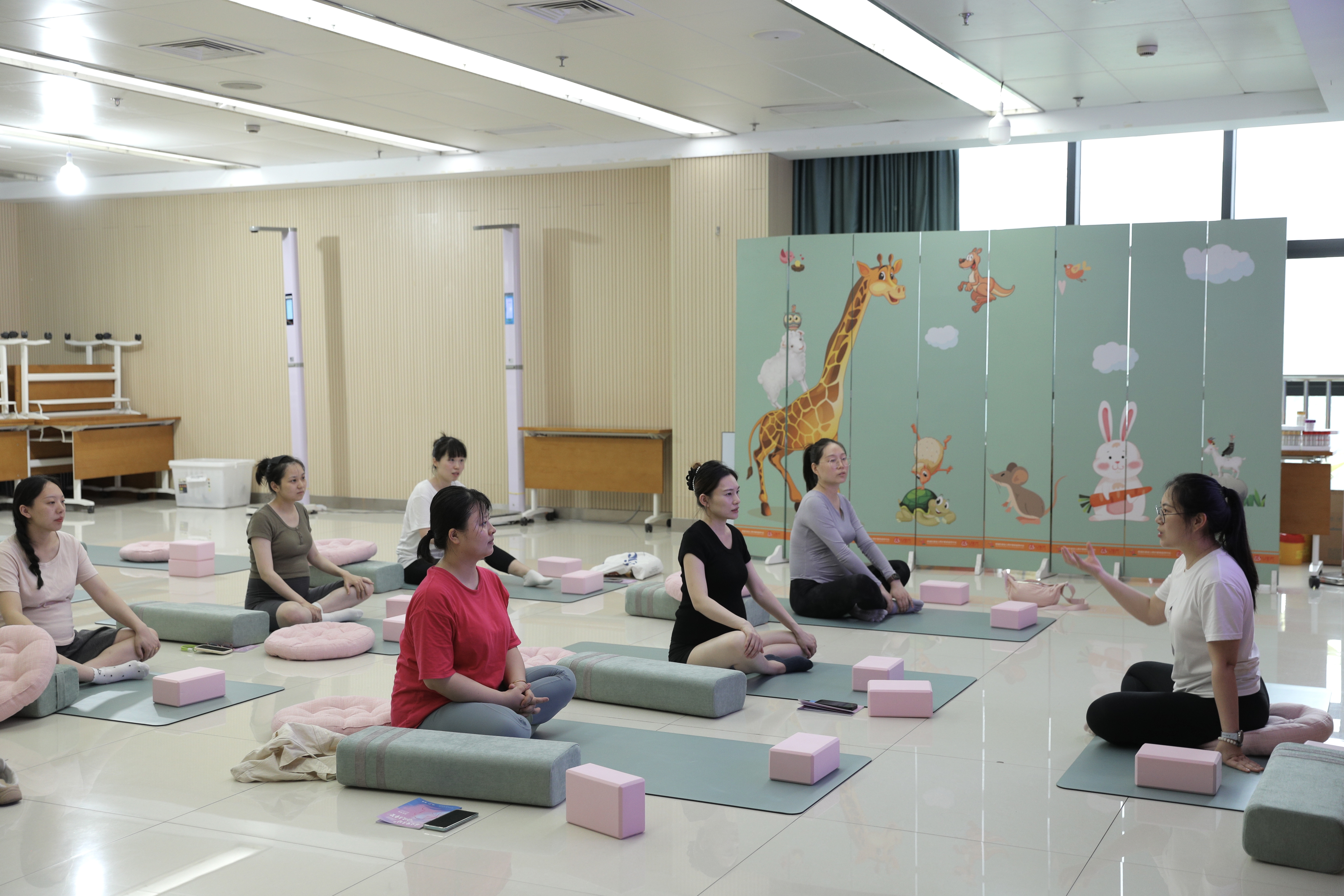 在一吸一呼中,准妈妈们逐渐卸下焦虑,放松身体,随着呼吸节奏优雅舒展脊椎,感受着原本紧绷的腰背一点点松弛下来,与未出世的生命达成一次次默契的呼吸共鸣。课程临近尾声,准妈妈们侧躺着,以舒服的姿势倚着抱枕,面带微笑,轻轻进入深度放松环节。
