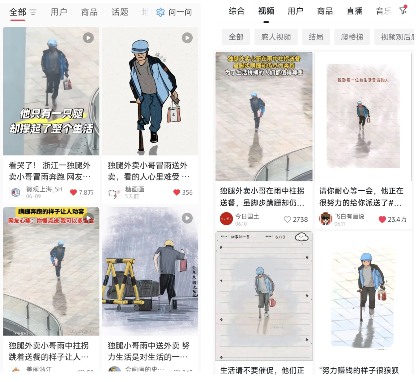 视频被上传到网络后,也迅速引发了网友们的共鸣,收获了近四十万点赞与无数暖心评论。《钱江晚报》随后进行了深度报道,美丽浙江、微观上海_SH、秀SHOW·江西等各地融媒体平台纷纷转载,还有自媒体创作者将这一幕绘成画作。无数温暖的留言中,饱含着人们对这位陌生骑手的敬意与关怀。