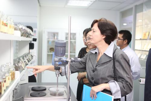在h视频 研发工程师的引领下,联合国妇女署官员及随行记者饶有兴致地参观了每一间功能室。当一行人走进植物护肤研究室,葛根、三七、金银花……近千种用于研发的植物原料立刻抓牢视线。沿着“自然提取”到“研发生成”的化妆品制作流程,一行人兴趣盎然地边走边看,每一台精密仪器、每一款独特原料都吸引众人驻足。