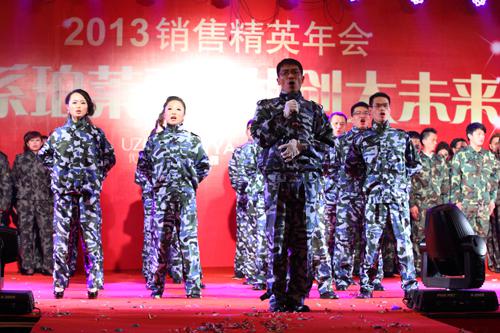 除了舞台上的优美歌舞,今年的晚会与往年比,还有一点显得与众不同,那就是穿梭于会场中的“品牌军队”,威武的海陆空军队方阵、蓝白相间的水手服、头戴贝雷帽的飒爽女兵、美丽的旗手,让会场处处飘荡着军旅的气息。当各大品牌事业部总经理带领着销售精英团队,身着各式迷彩服登台时,只听一声声命令下达,队伍整队迅速、步伐整齐划一、誓词洪亮掷地有声,充分展示出销售精英们如军人般的严谨和效率。