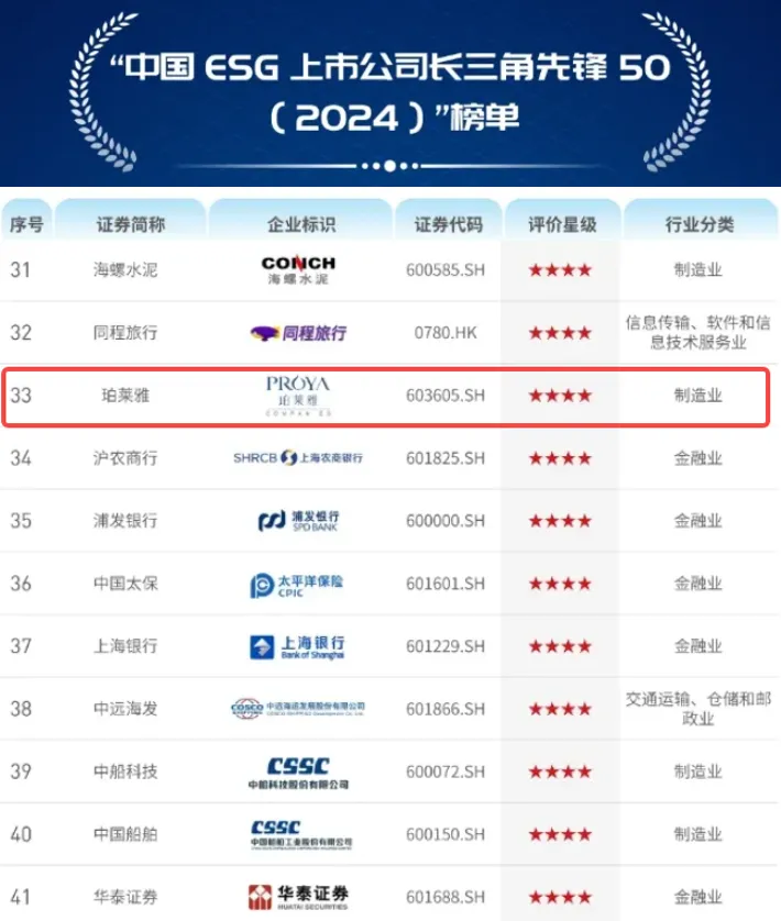 As of today, Proya has fully disclosed its principles and performance in sustainability and ESG governance for four consecutive years in accordance with relevant standards. The company's commitment to sustainability and ESG management has consistently earned recognition from both the public and the capital markets. In 2024, Proya became the first Chinese cosmetics brand to achieve independent third-party carbon data verification and report assurance. In 2023, the company completed the CDP Climate Change Questionnaire for the first time and earned a B rating, surpassing the average C rating for companies in Asia and worldwide. In December 2023, Proya's Wind ESG Rating was upgraded to AA, securing its first top position in the personal care products industry. In 2024, the company received an AA rating from Sino-Securities Index ESG Ratings, ranking first in both the major consumer goods sector within the Sino-Securities' Tier 1 Industry Classification and the personal care products sector within the GICS Tier 3 Industry Classification.