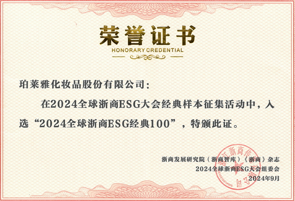 As the Environmental, Social, and Governance (ESG) concept rapidly evolves on a global scale, its significance in business management has become increasingly vital. ESG closely aligns enterprises with sustainable development goals and is highly compatible with the national "dual carbon" goals. As a leading Zhejiang enterprise in the domestic cosmetics sector, Proya has proactively addressed global sustainable development demands over the years. We have strengthened our ESG management system and significantly enhanced our performance across environmental, social, and corporate governance dimensions.