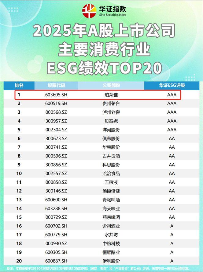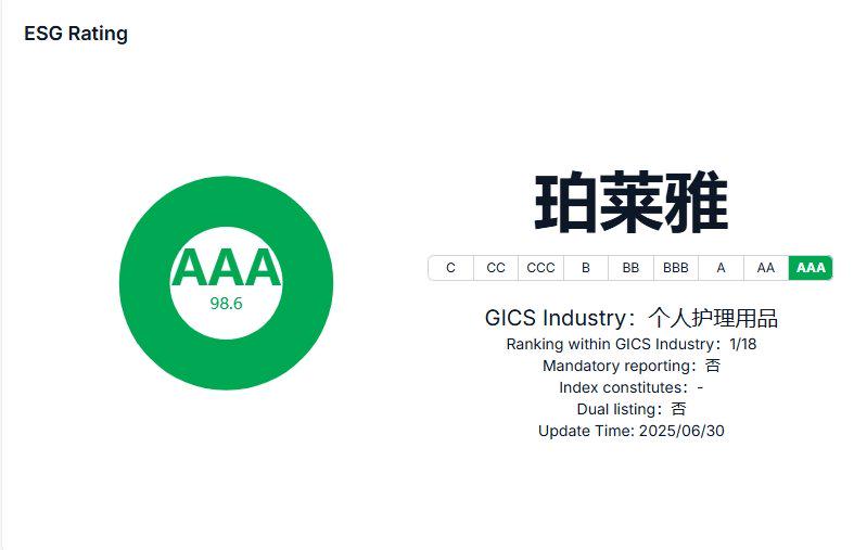 Recently, Sino-Securities Index Information Service (Shanghai) Co., Ltd. ("Sino-Securities Index") released its latest 2025 ESG rating results. Proya (603605.SH) was successfully upgraded from AA to the highest possible rating of AAA. The company has now held the top position in the personal care category for two consecutive years. According to official statistics from Sino-Securities ESG Ratings, in the latest rating cycle (20250430), only 62 listed companies received an AAA rating, accounting for approximately 1.1% of all A-share listed companies.