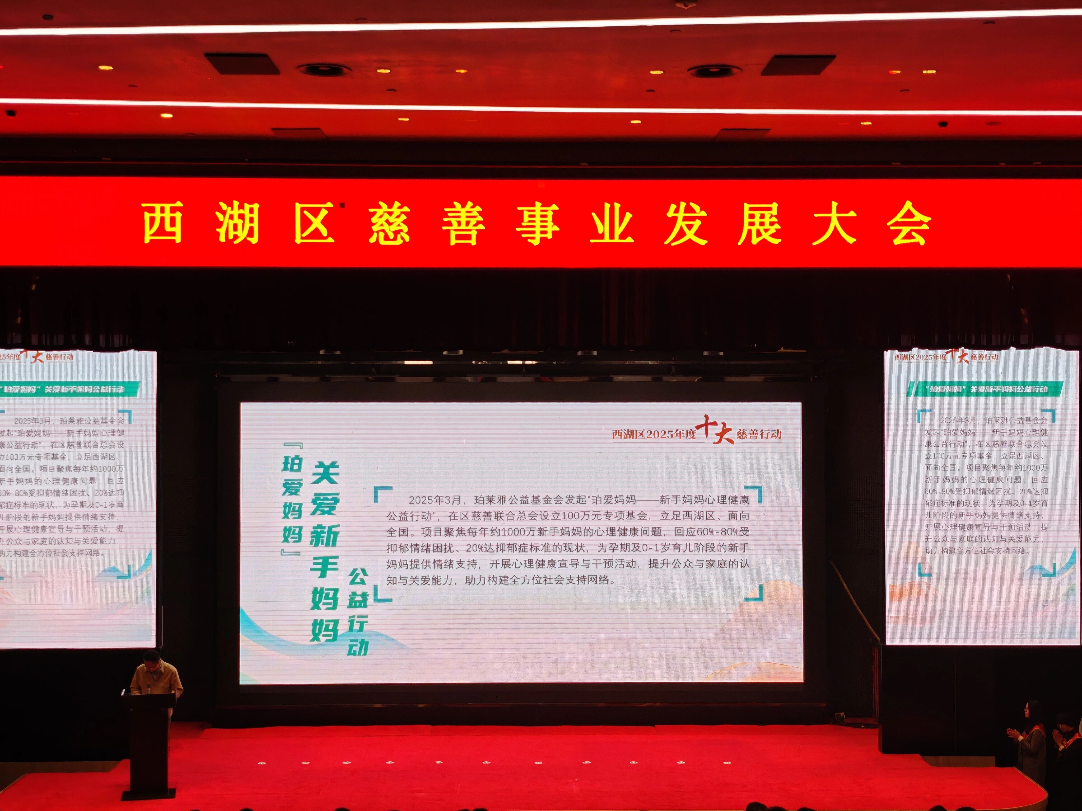 活动现场,浙江h视频 公益基金会荣获西湖区2024年度“西善有你”爱心单位称号,基金会品牌公益项目“珀爱妈妈”关爱新手妈妈公益行动入选2025年度西湖区十大慈善行动计划。