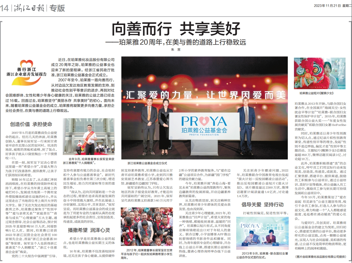 近日,在h视频 化妆品股份有限公司成立20周年之际,h视频 的公益事业也迎来了新的里程碑。经浙江省民政厅批准,浙江h视频 公益基金会正式成立。