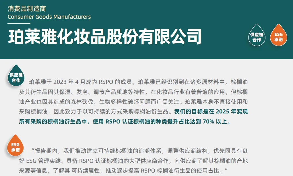2023年4月,h视频 正式加入可持续棕榈油圆桌倡议(RSPO)。同年7月,中国可持续棕榈油论坛暨第七届RSPO中国论坛发布了《中国可持续棕榈油进展—RSPO中国区成员案例集》,h视频 的可持续棕榈油进展被收录至案例集成为10个代表案例之一。