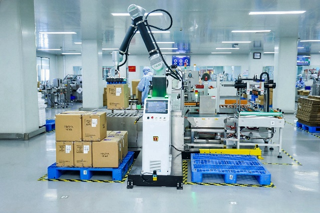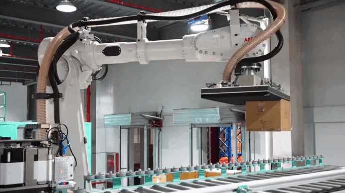 在这里,你可以看到拆垛机器人忙碌地将一箱箱产品整齐地码放在托盘上。一组拆垛机器人一天能够完成4位装箱工人1500次的搬箱及搬运动作,不仅为员工节省了大量的时间和精力,还大大提高了生产效率。