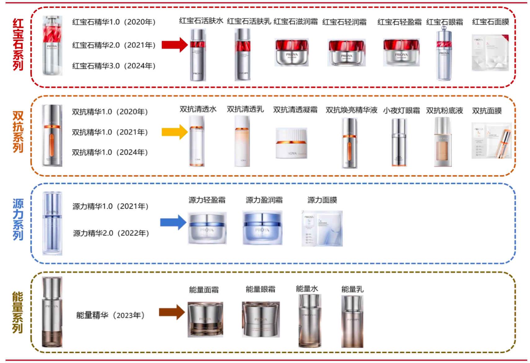 品牌目前拥有8个主要产品系列,包括双抗、源力、红宝石、能量系列等,每个系列的主要功效点各有侧重。