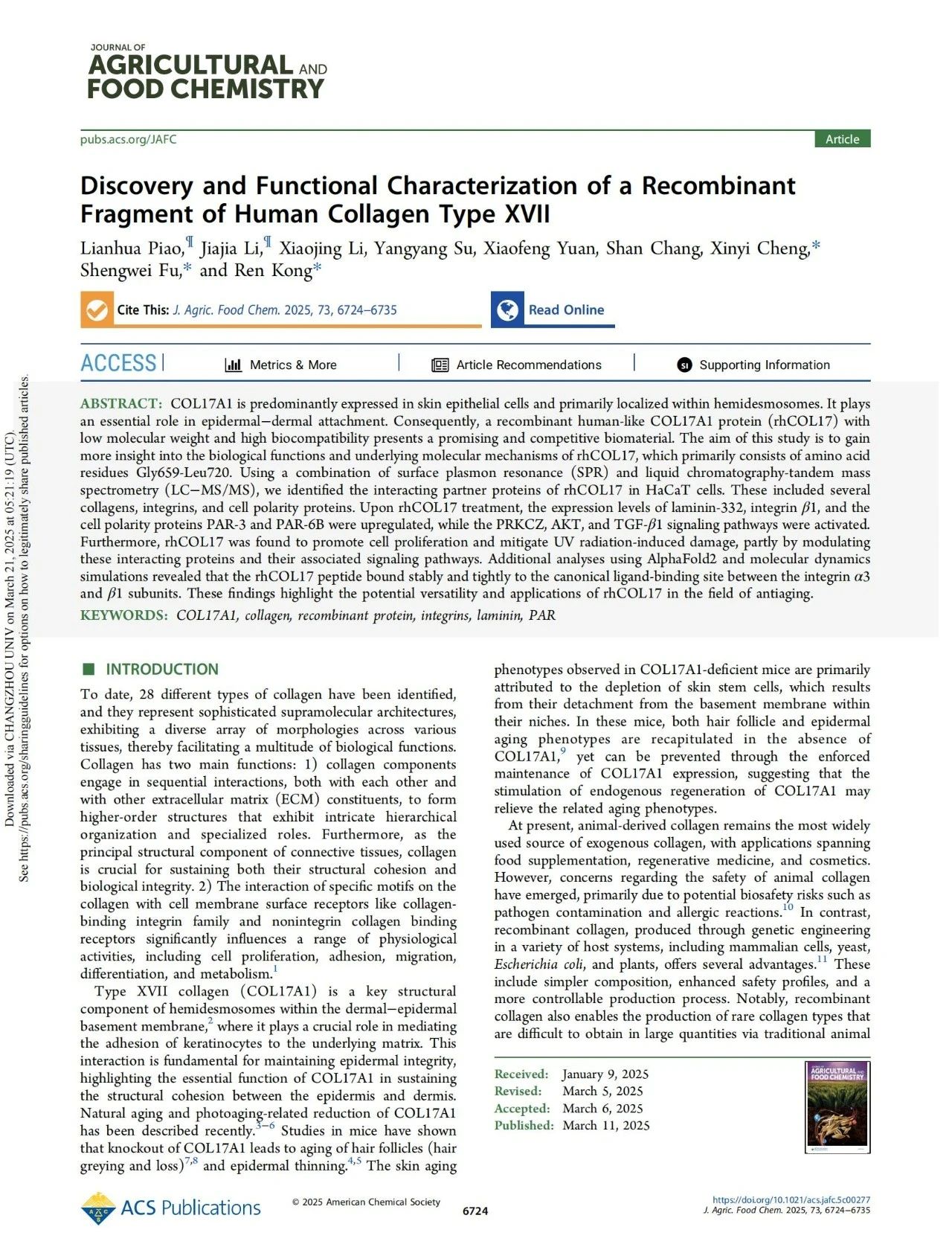 在火热的重组胶原蛋白领域,h视频 和创健医疗合作共研基底膜修护关键原料重组XVII型胶原蛋白。近期,创健医疗联合江苏理工学院和h视频 共同完成的重磅研究成果《Discovery and Functional Characterization of a Recombinant Fragment of Human Collagen Type XVII》已在国际权威期刊《Journal of Agricultural and Food Chemistry》(SCI一区)刊登。