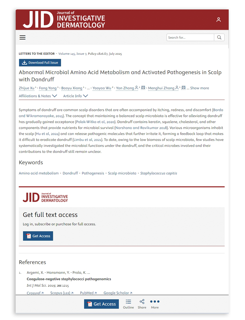 这一系列发现为头屑成因提供了全新的研究依据,相关研究论文已发表在皮肤学领域全球权威期刊《Journal of Investigative Dermatology》上,获得了国际学术界的高度认可。