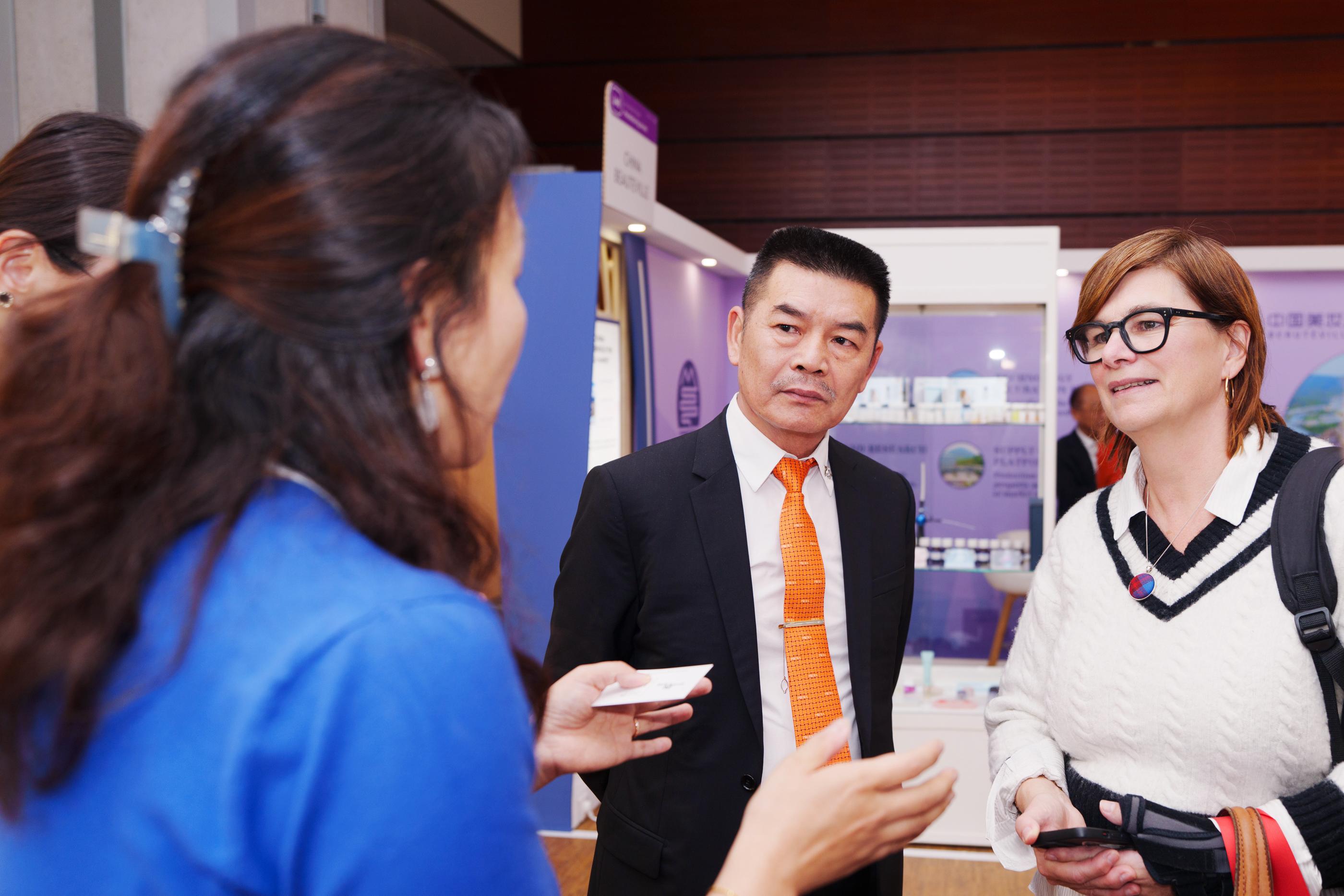 股份展位吸引了中国驻法大使邓励的莅临参观。邓励大使详细听取了企业在科研创新、国际化发展的情况,察看了三大品牌的产品,并与侯军呈就中国美妆行业发展情况进行了交流。
